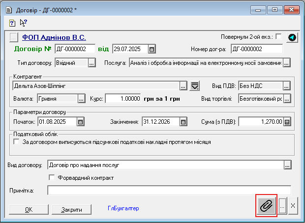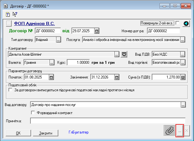 У діалоговій формі документа крім контрагента, з яким заключається договір, слід вказати валюту договору, її курс, процентну ставку ПДВ. Ці значення будуть підставлятися в одноіменні реквізити всіх документів послідовності, в якій цей договір був обраний як документ-замовлення. У реквізиті «Номер договору» можна вказати номер реєстрації справжнього го договору у контрагента у тому випадку, якщо він не збігається з нашим внутрішнім номером (зазначеним у реквізиті «Договір №»).