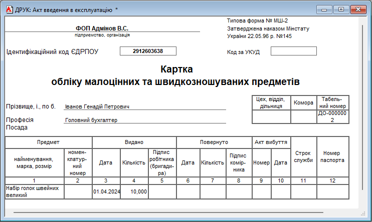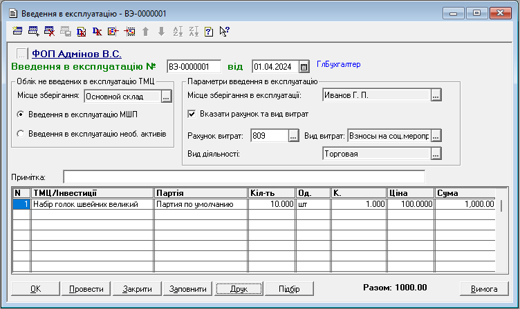 Документ «Введення в експлуатацію» застосовується при введенні даних про початок використання основних засобів, формуванні бухгалтерських проводок та звітності. Він забезпечує точність обліку активів і автоматизацію контролю за їх рухом та станом на підприємстві.