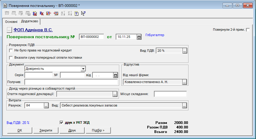 Документ «Повернення постачальнику» застосовується при введенні даних про повернення товарів постачальникам, формуванні бухгалтерських проводок та звітності. Він забезпечує точність обліку руху товарів і автоматизацію контролю за взаєморозрахунками з контрагентами.