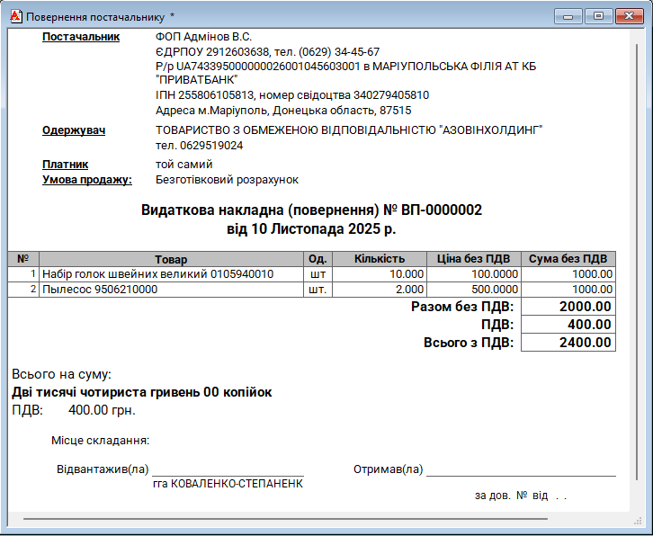 Документ «Повернення постачальнику» використовується для оформлення операцій із повернення товарів постачальнику. Він забезпечує коректне відображення руху товарів та взаєморозрахунків із контрагентами у бухгалтерському обліку.