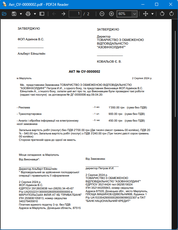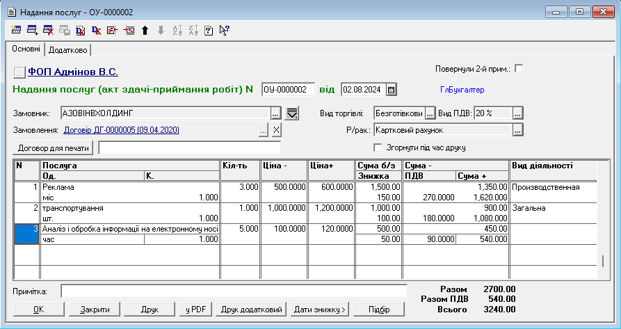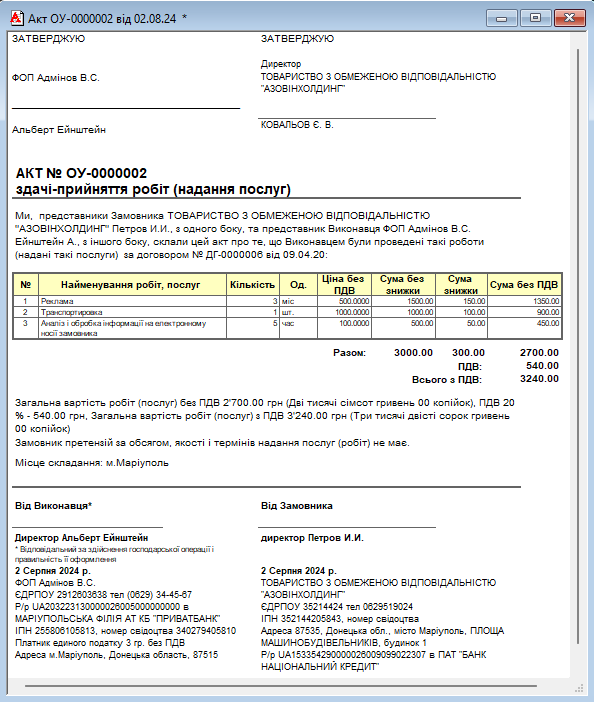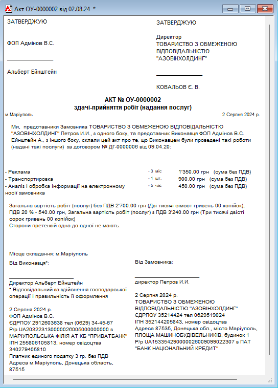 Основним результатом роботи з документом є друк Акта здачі-приймання наданих послуг. Ця форма містить перелік робіт, їх вартість та юридичні реквізити сторін.