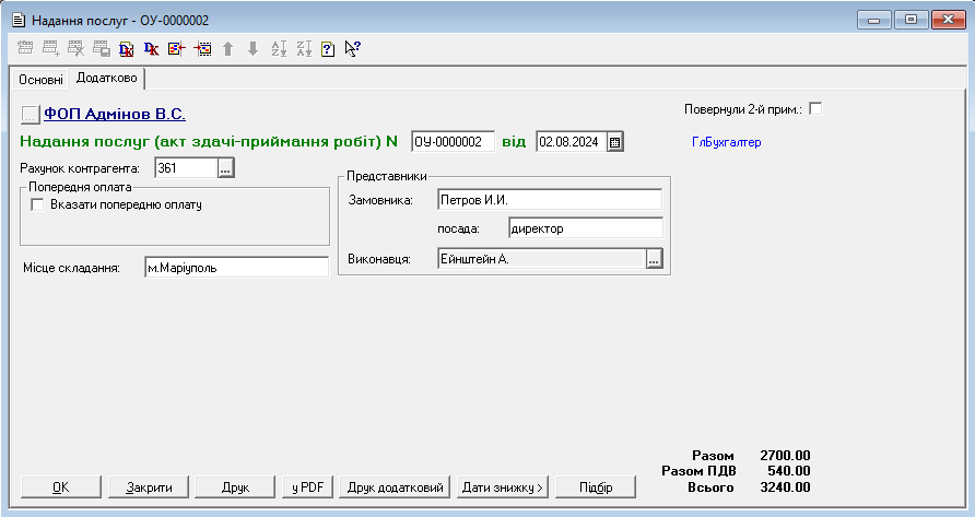 До друкованої форми «Акту наданих послуг» додана посада директора контрагента.