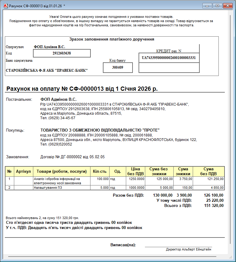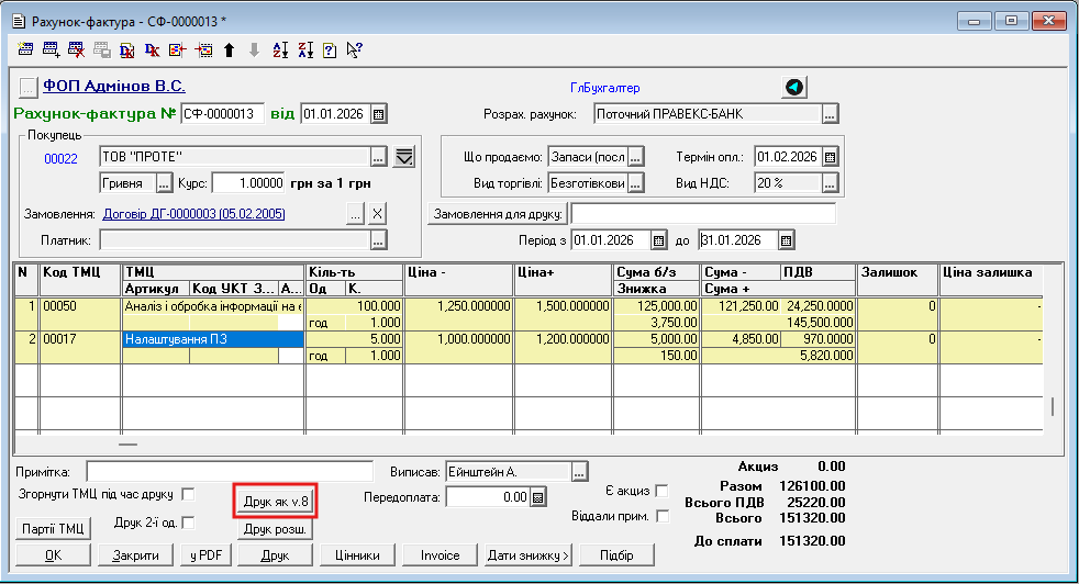 Додана друкована форма «Рахунок на оплату» у форматі 1С 8.2 та процедура збереження її у файл формату «PDF».