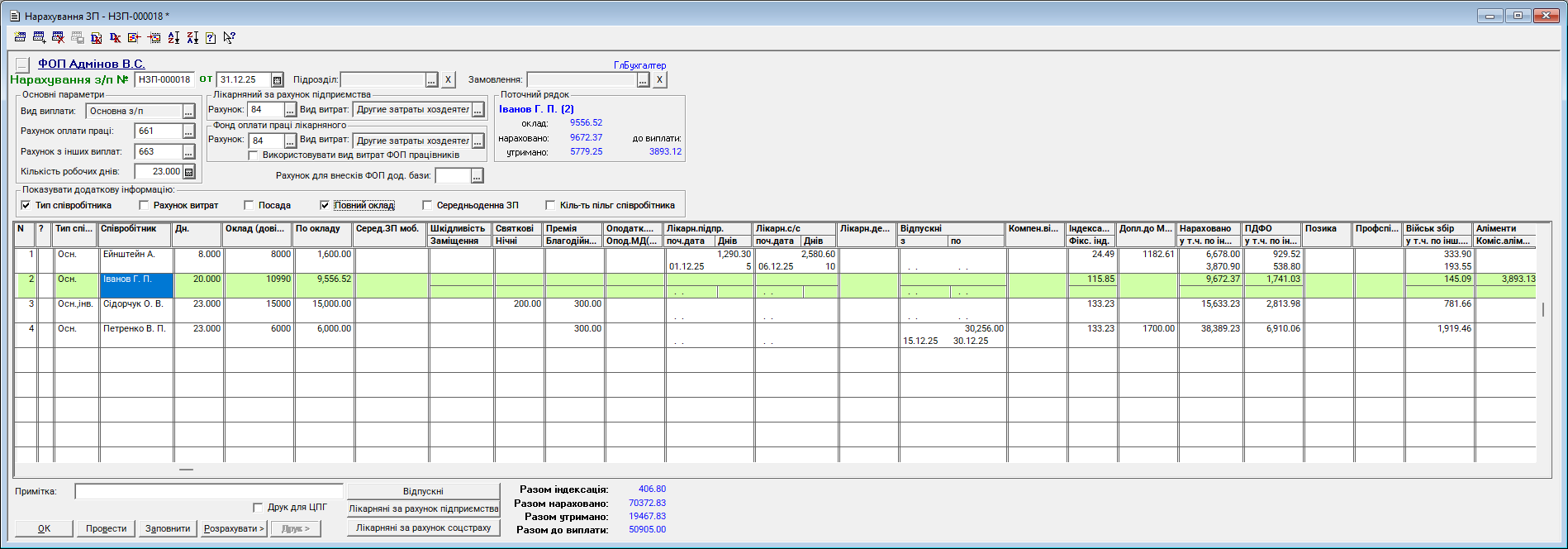 У графах "Нараховано", "Утримано", "До виплати" відобразяться підсумкові суми всіх нарахувань, утримань по співробітнику та сума, що підлягає до виплати.