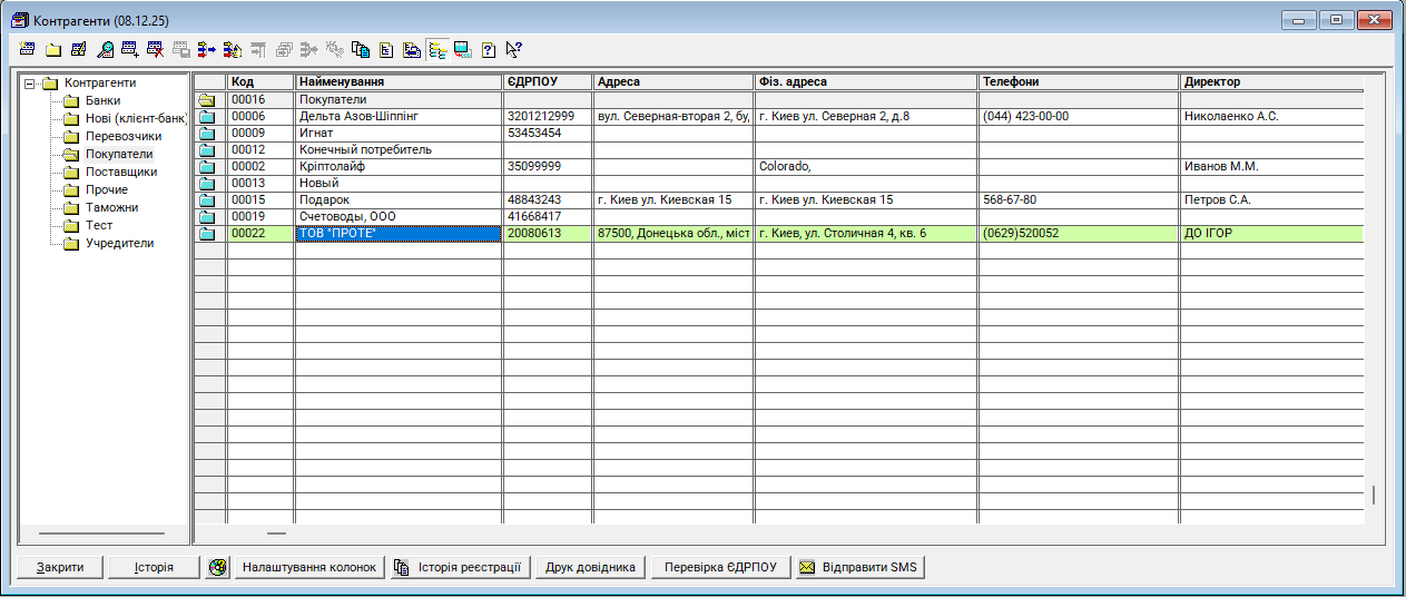 Довідник "Контрагенти" використовується для зберігання інформації про юридичних та фізичних осіб, з якими підприємство здійснює господарські операції. Він забезпечує коректне ведення обліку розрахунків із постачальниками, покупцями, підрядниками та іншими партнерами.