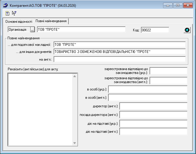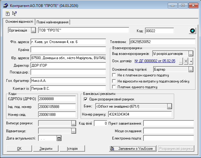 Додана функція заповнення інформації (повна назва, коротка назва, назва на анлг.мові, юр.адреса, ПІБ керівника, посада керівника, контакнтний телефон, ІПН, e-mail, дата актуальності даних) по контрагенту з сайта Youscore.com.ua (при наявності діючого ключа).