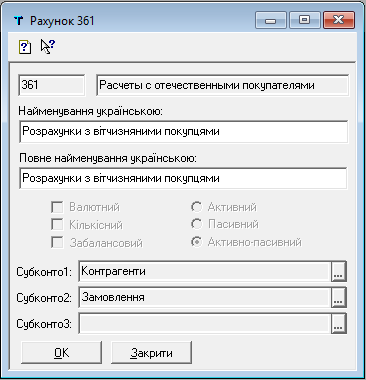 | Код | Найменування (укр.) | Вал. | Кіл. | Заб. | Акт. | Субконто1 | Субконто2 | Субконто3 | |