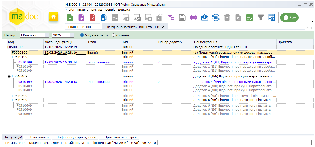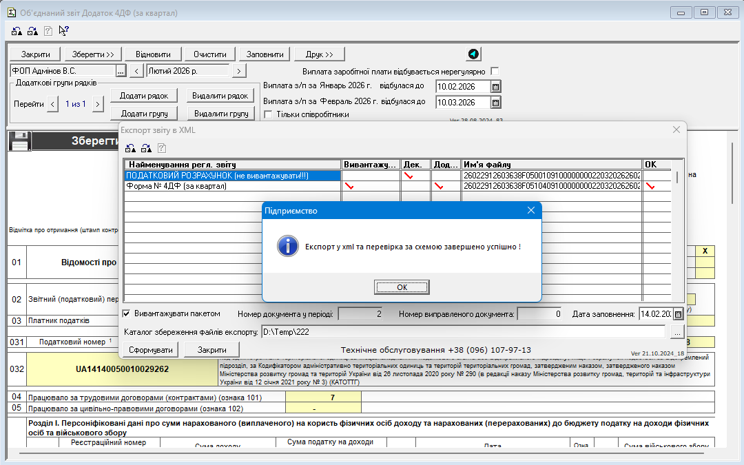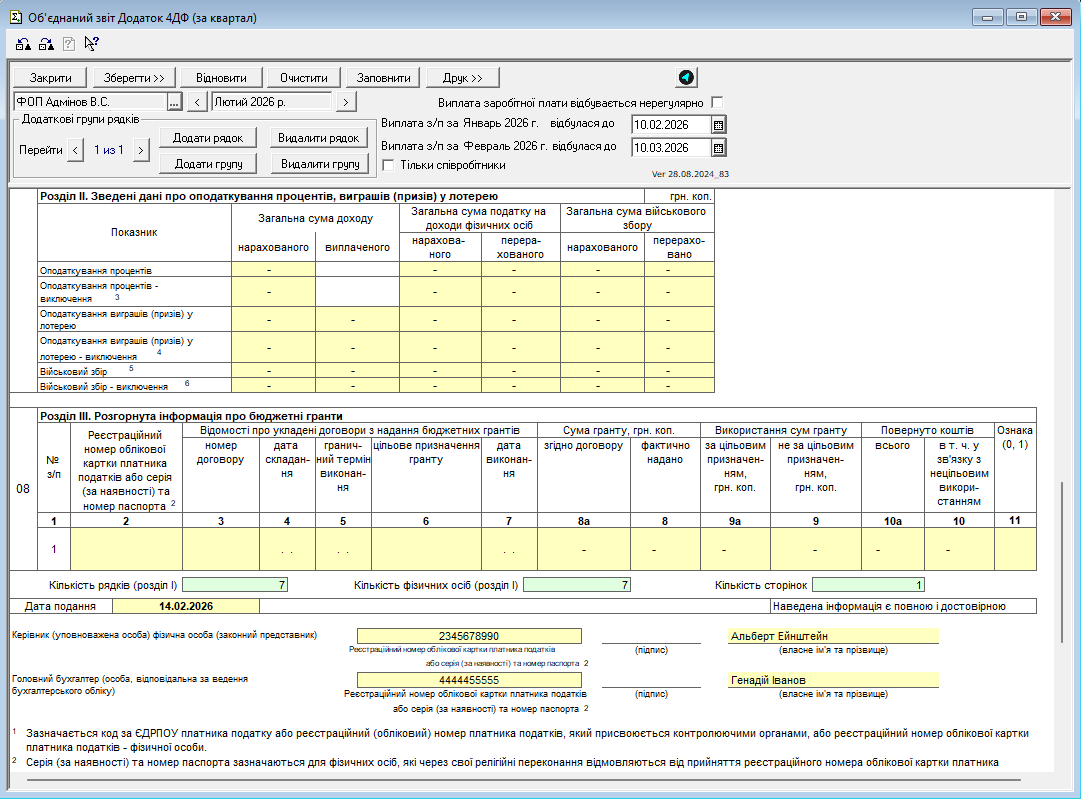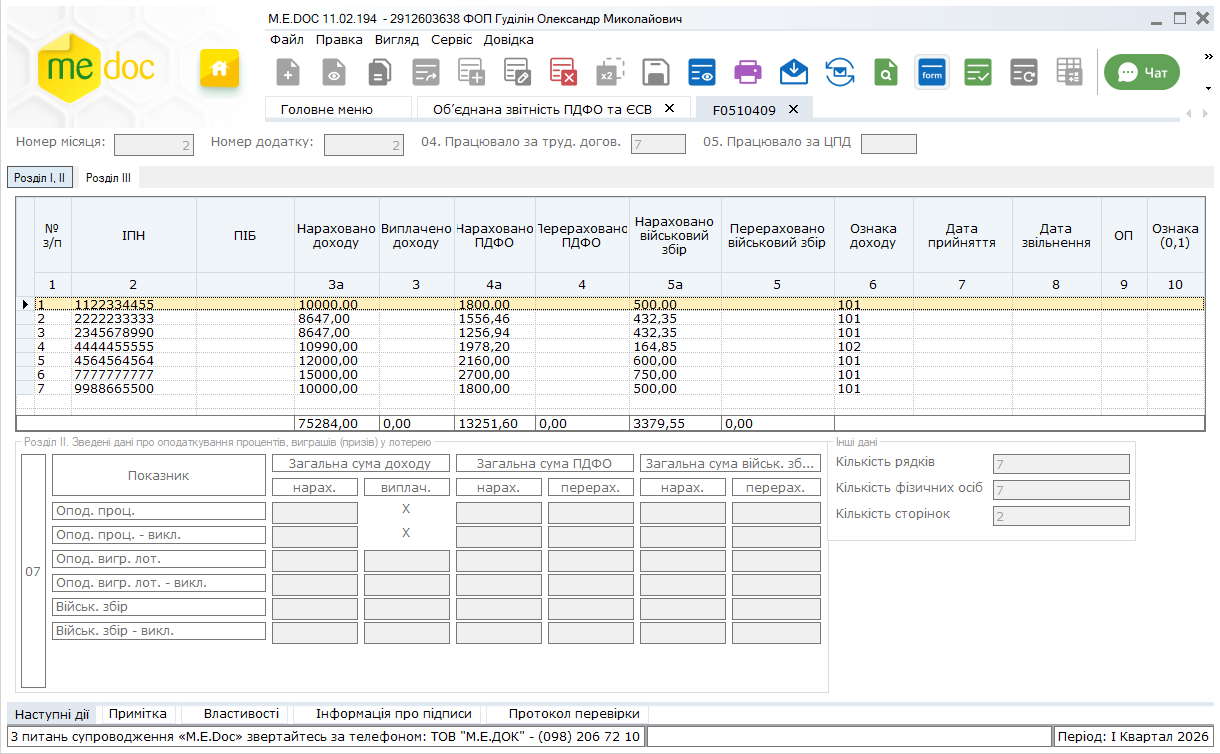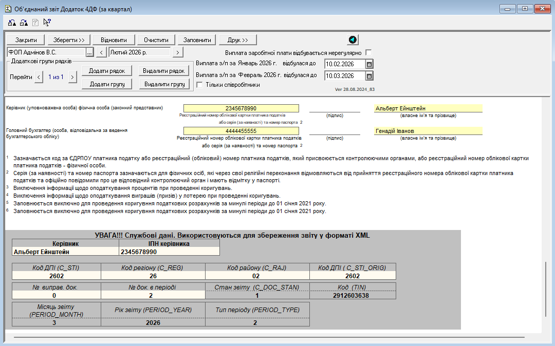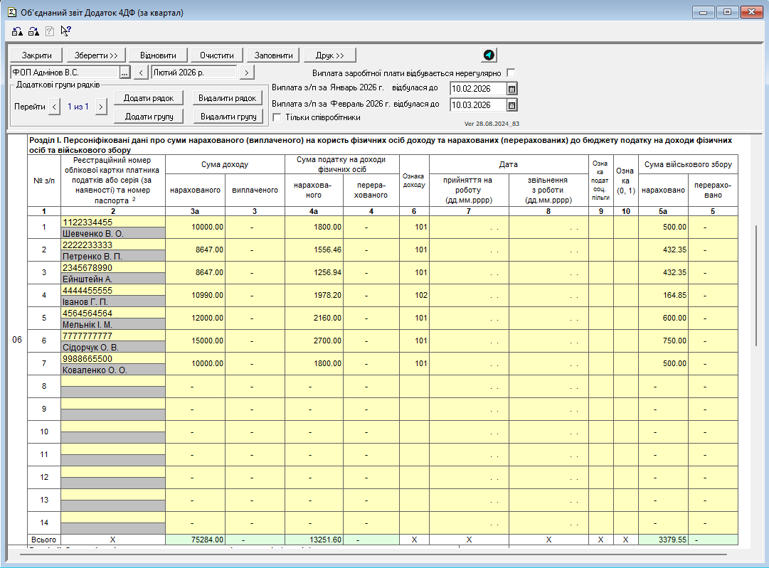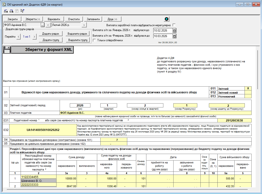Звіт «Додаток 4ДФ» (Відомості про суми нарахованого доходу, утриманого та сплаченого податку на доходи фізичних осіб та військового збору) у програмі «Бухгалтерський облік для України 7.7» — це регламентований квартальний звіт для ФОП-роботодавців. Він замінив стару форму 1ДФ і містить детальну інформацію про податкові відрахування в розрізі кожного місяця кварталу.