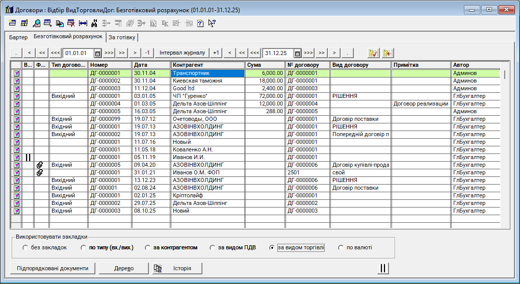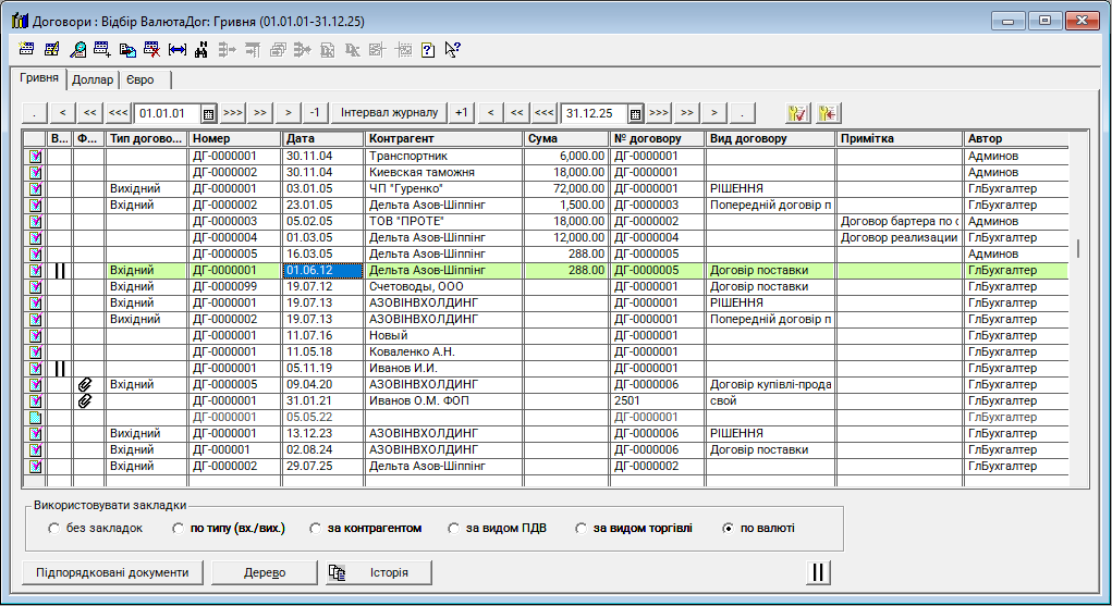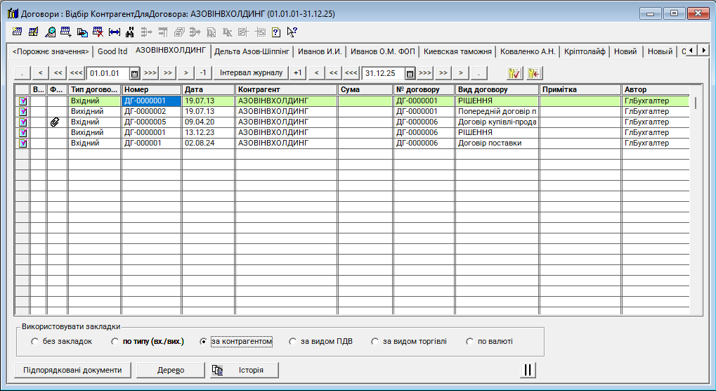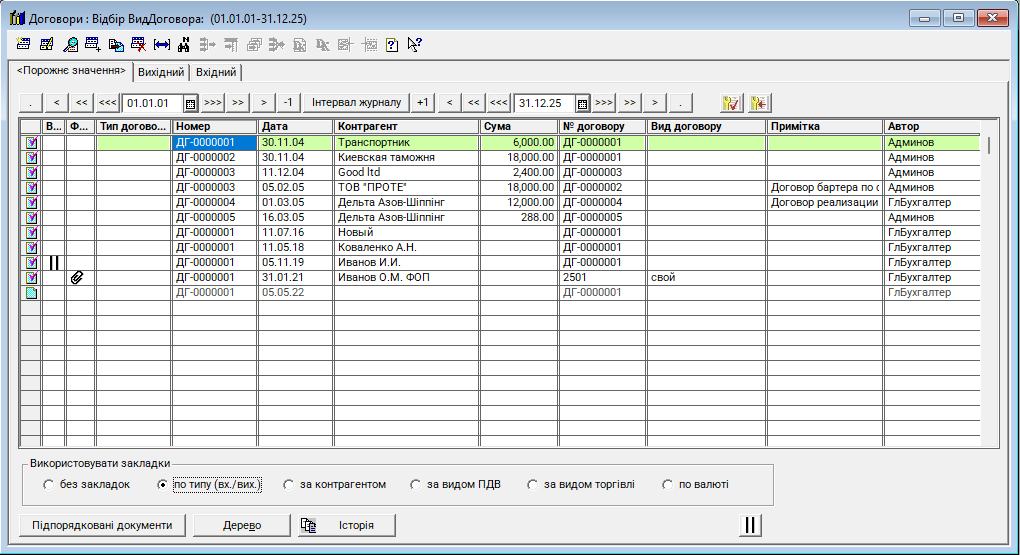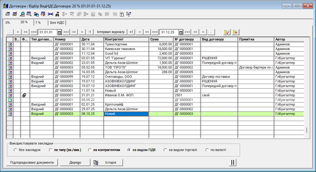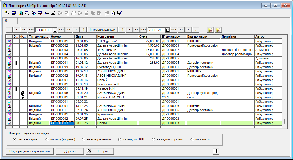 Журнал "Договори (із закладками)" - це новий журнал (відсутній у стандартній конфігурації), використовується для реєстрації та систематизації всіх договорів, укладених підприємством із контрагентами. Він забезпечує контроль за виконанням договірних зобов’язань та правильність відображення операцій у бухгалтерському обліку. Журнал аналогічний стандартному, в ньому додані закладки для розмежування документів за типом (вх./вих.), контрагентами та за видом ПДВ.