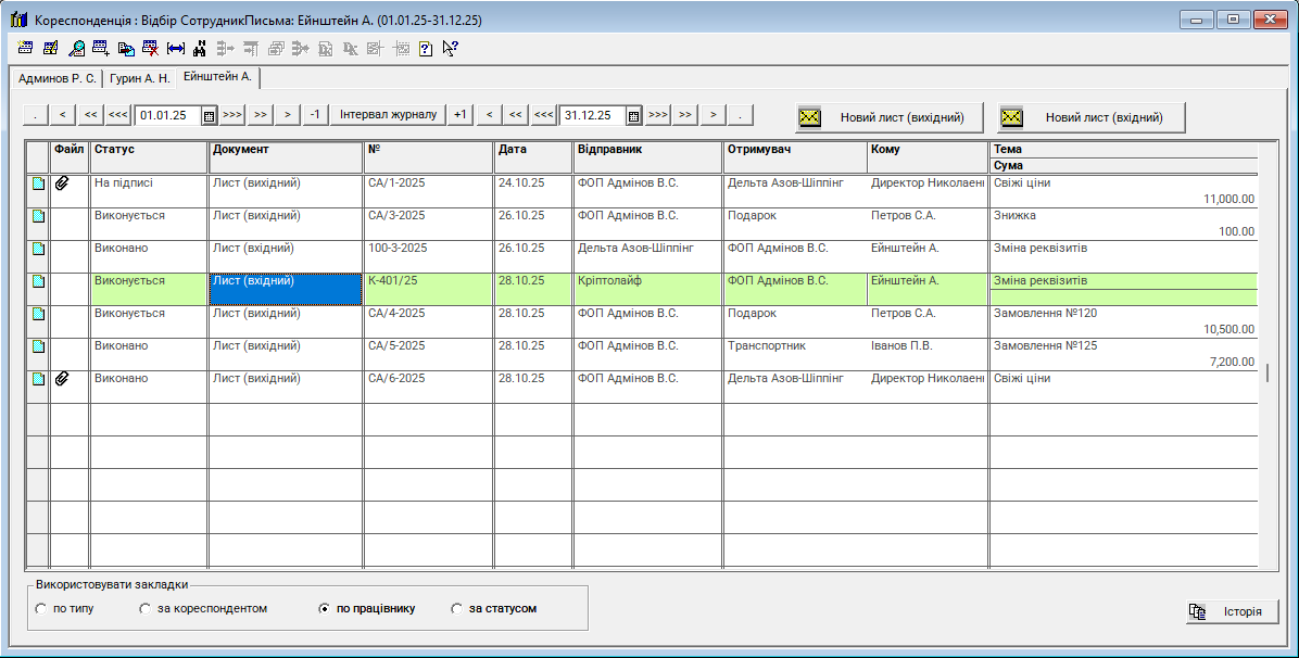 Головною особливістю журналу є можливість відстеження статусу кожного документа за допомогою спеціалізованих вкладок (фільтрів):