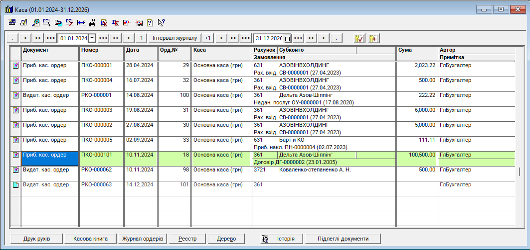 Журнал "Каса" дозволяє бухгалтеру вести щоденний контроль за залишками та рухом готівки в національній та іноземній валютах. Цей журнал забезпечує не лише перегляд документів, а й швидку перевірку їхнього стану: чи сформовані бухгалтерські проводки (рожева галочка), чи документ просто збережений без впливу на баланс.