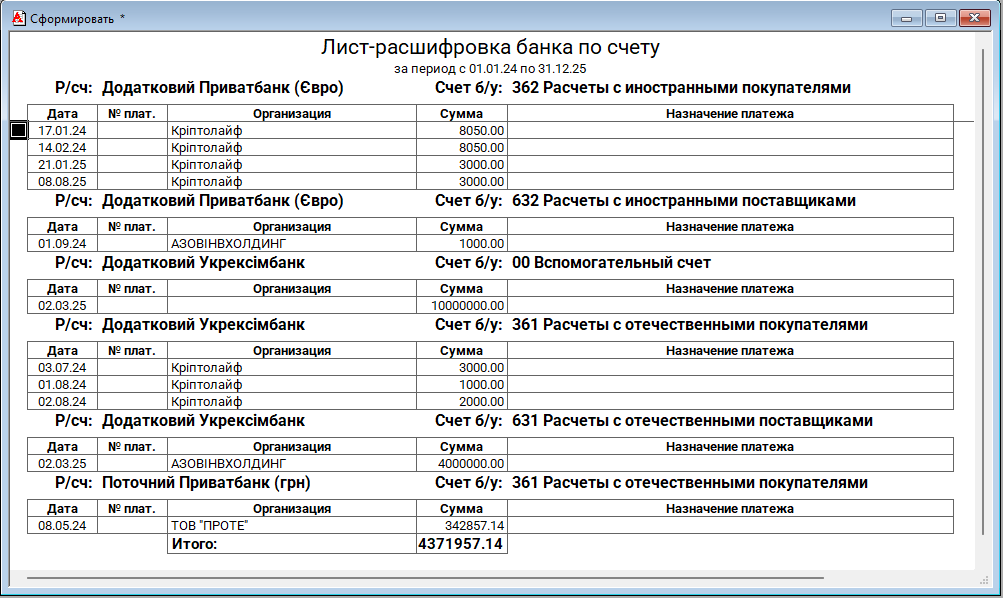 Лист-розшифрування банку за рахунком
