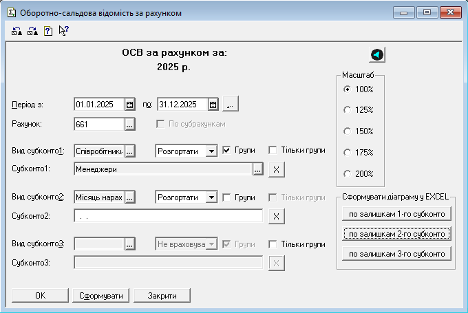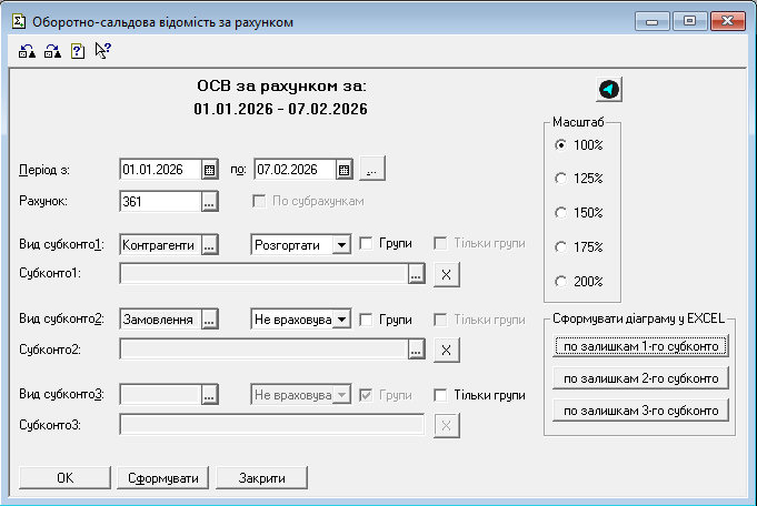 Аналітика (Субконто): користувач може обрати, за якими саме об'єктами (контрагенти, договори, номенклатура) слід згрупувати дані. Можна виводити як один рівень аналітики, так і декілька одночасно.